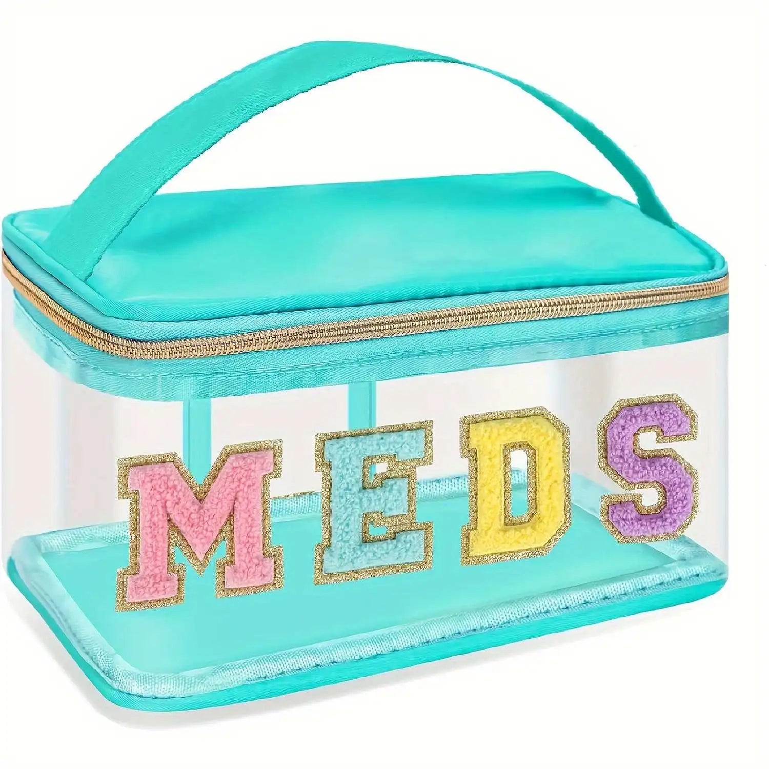 Need a cute little bag just for your meds, vitamins, or daily essentials? This is it! This clear PVC bag with Chenille letter patches is PRECIOUS, and it comes in six colors!