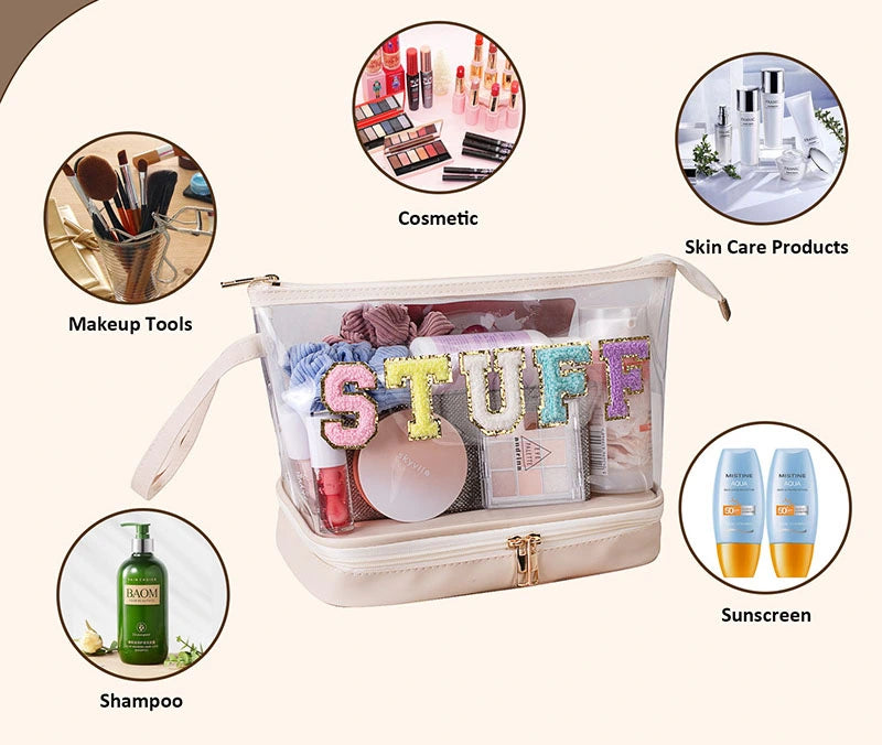 Keep all your must-haves safe, stylish, and splash-proof with this cute transparent PVC “STUFF” bag! ✨ The clear design with pastel letters makes it easy to see what you’ve packed, while the waterproof material keeps your items protected. Perfect for travel, beach days, makeup, or everyday essentials.